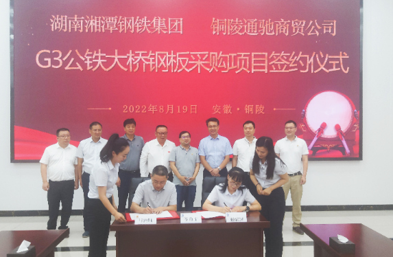 8月19日上午,集團(tuán)公司黨委副書記、總經(jīng)理周文勝在G3銅陵長江公鐵大橋項(xiàng)目部會見湘鋼集團(tuán)黨委書記、執(zhí)行董事、總經(jīng)理?xiàng)罱ㄈA一行。雙方就鋼板材料、物流服務(wù)等方面開展深入交流,并共同見證湘鋼集團(tuán)與市交投集團(tuán)司屬通馳商貿(mào)公司簽訂G3銅陵長江公鐵大橋鋼板采購項(xiàng)目合作協(xié)議。中鐵大橋局G3銅陵長江公鐵大橋項(xiàng)目部經(jīng)理劉幸福及集團(tuán)公司黨委委員、副總經(jīng)理范美霞、湯世才,總工程師張葉來出席簽約活動(dòng)。