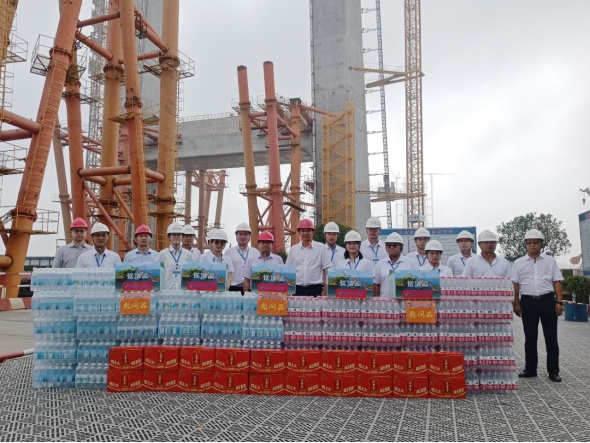 在G3公鐵橋北岸項目點,集團(tuán)公司黨委副書記、總經(jīng)理龍道寧在黨委委員、副總經(jīng)理湯世才和工會相關(guān)負(fù)責(zé)同志的陪同下,為他們送去防暑降溫用品,并向施工人員對項目建設(shè)所付出的辛勞表示感謝。他反復(fù)叮囑大家要注意自身防護(hù),防止中暑,平安度夏;項目施工方要密切關(guān)注高溫天氣,實行“抓兩頭、歇中間”的避高溫措施,合理安排工程量,確保人員身心健康。