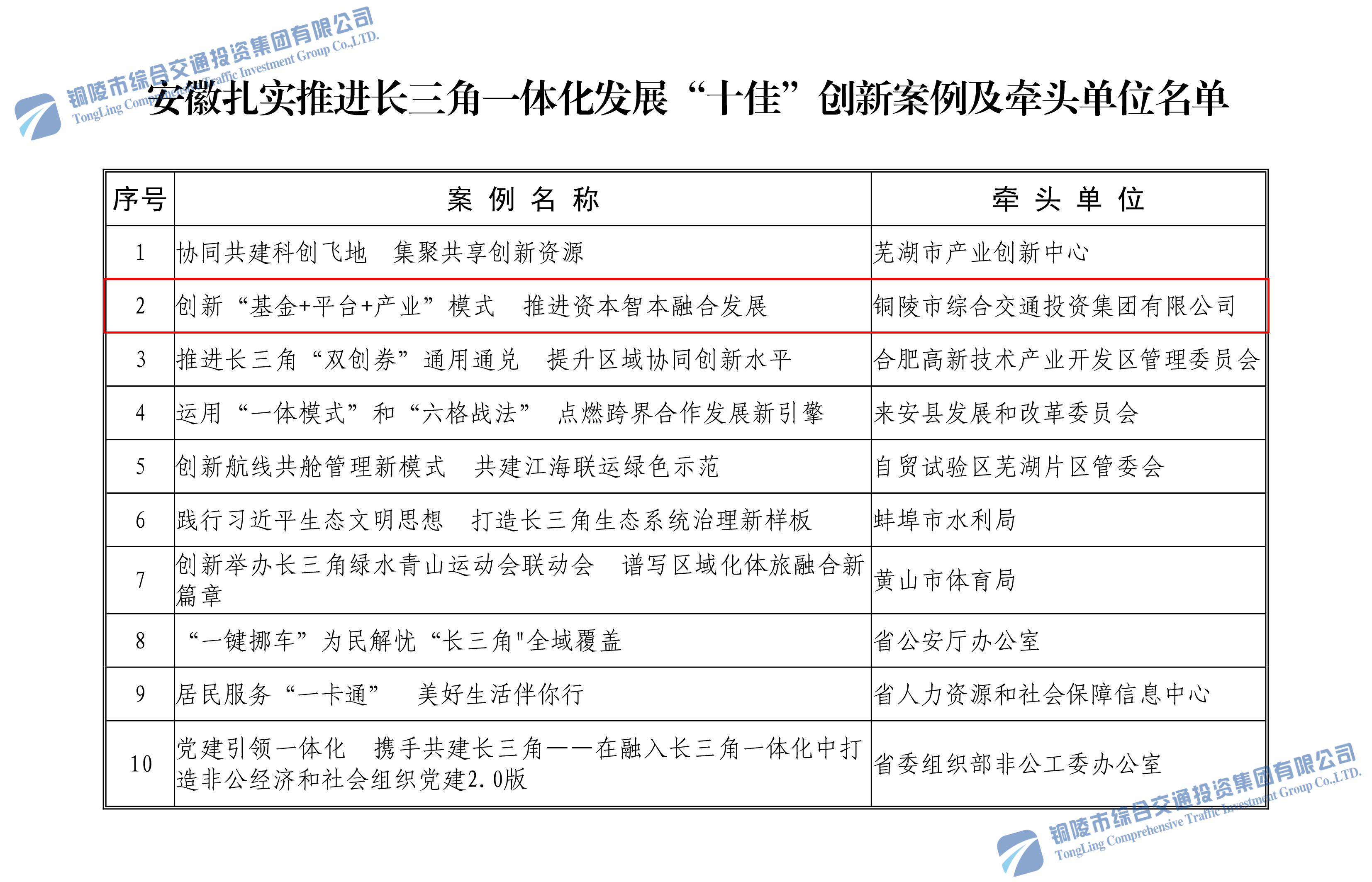 長三角一體化發(fā)展是習(xí)近平總書記親自謀劃、親自部署、親自推動(dòng)的重大國家戰(zhàn)略。習(xí)近平總書記關(guān)于長三角一體化發(fā)展的重要講話重要指示,深刻闡述了長三角區(qū)域的重要地位和作用,明確指出了長三角一體化發(fā)展的重大使命、重點(diǎn)任務(wù)、方法路徑和根本保障,為推動(dòng)長三角一體化發(fā)展指明了前進(jìn)方向、提供了根本遵循。今年是長三角一體化發(fā)展上升為國家戰(zhàn)略5周年,也是長三角地區(qū)主要領(lǐng)導(dǎo)座談會(huì)安徽“輪值年”,為扎實(shí)推進(jìn)長三角更高質(zhì)量一體化發(fā)展,全面展示全省各地區(qū)各部門的創(chuàng)新做法、顯著成效,積極探索長三角更高質(zhì)量一體化發(fā)展新路徑,今年1月,省長三角辦面向全省各有關(guān)單位征集推進(jìn)長三角一體化發(fā)展創(chuàng)新實(shí)踐案例,并于3月下旬組織召開專家評(píng)審會(huì)。集團(tuán)公司報(bào)送的《創(chuàng)新“基金+平臺(tái)+產(chǎn)業(yè)”模式打造銅陵科創(chuàng)產(chǎn)業(yè)園》案例經(jīng)過初篩入圍、現(xiàn)場答辯、專家評(píng)審等選拔,從133篇?jiǎng)?chuàng)新案例中脫穎而出,成功遴選為40篇優(yōu)秀創(chuàng)新案例之一,并最終乘勝追擊成功入選省“十佳”案例。