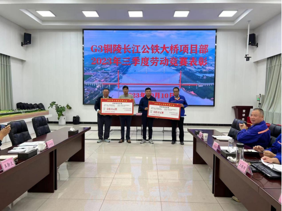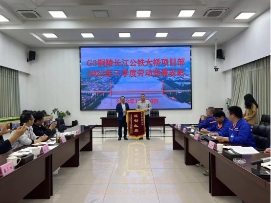會議首先表彰了G3銅陵長江公鐵大橋項目第三季度勞動競賽獲獎單位。隨后,聽取了關于項目進展情況及存在的問題,并明確了第四季度施工生產(chǎn)的計劃,簽訂了目標工期責任書。