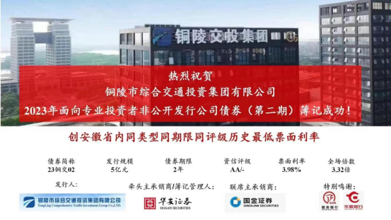 在監(jiān)管環(huán)境愈加趨嚴(yán)、資本市場(chǎng)政策嚴(yán)格收緊的形式下,集團(tuán)公司周密部署、充分把握發(fā)行政策,10月26日,市交投集團(tuán)成功發(fā)行2023年度第二期非公開公司債,規(guī)模5億元,期限2年,票面利率3.98%,主承銷商華安證券,聯(lián)席主承銷商國(guó)金證券。