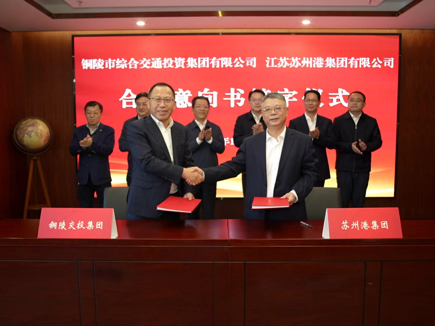 活動中,副市長楊如松與江蘇省港口集團(tuán)副總經(jīng)理顧國華代表市企雙方簽訂戰(zhàn)略合作協(xié)議,集團(tuán)公司黨委書記、董事長吳世偉與江蘇蘇州港集團(tuán)公司黨委書記、董事長吳紅代表兩企業(yè)簽定合作意向書。簽約儀式前,與會人員還參觀了江蘇省港口集團(tuán)企業(yè)文化展廳、生產(chǎn)調(diào)度(應(yīng)急)指揮中心。