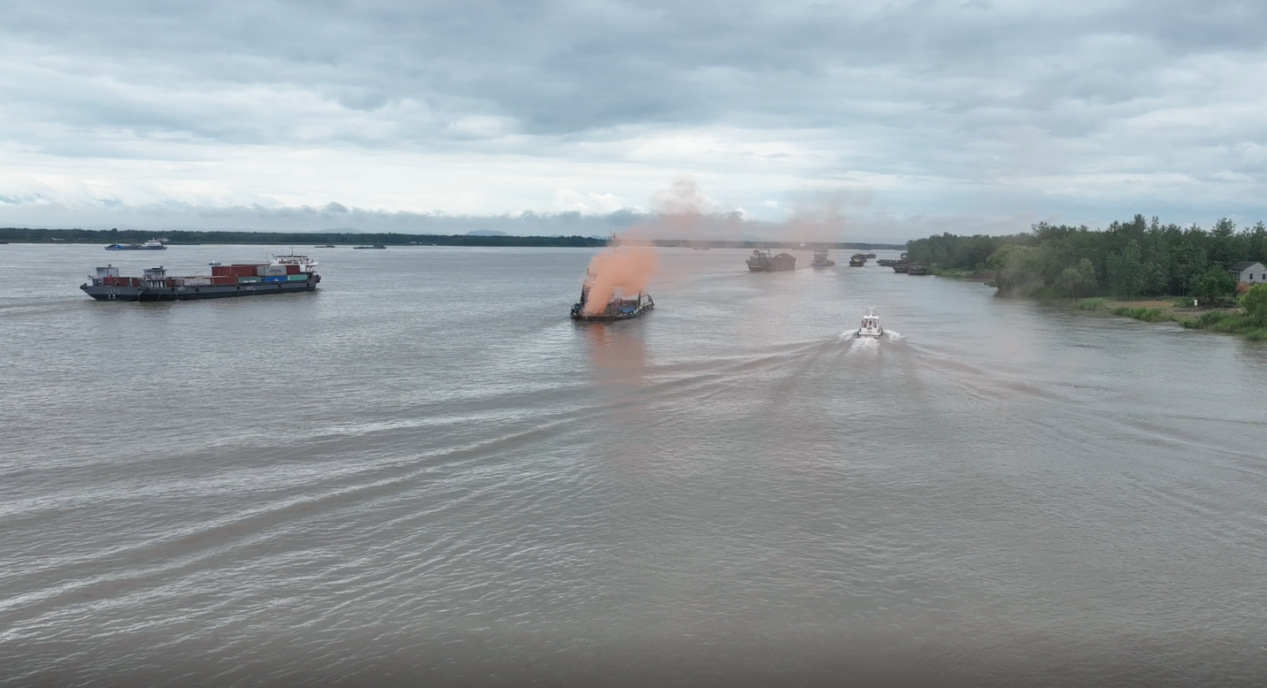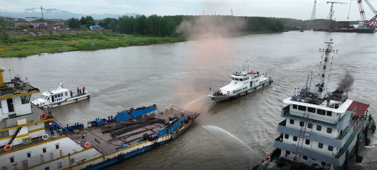 上午9點(diǎn),演練正式開始,演練場景分為兩部分。首先模擬“橋梁工程006”船只在距3#平臺上游600m附近水域因船舶失火,導(dǎo)致船舶失控,有碰撞主塔3#墩鋼圍堰的危險。項目部立即啟動應(yīng)急預(yù)案,聯(lián)合銅陵海事處共同撲滅大火,并將失控船舶拖綁至安全位置。