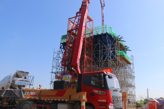 跨G347國道特大橋全長2.39公里(74孔),其中第42-44孔采用1聯(lián)(32+48+32)混凝土連續(xù)梁上跨G347國道,該連續(xù)梁采用懸臂澆筑法施工。此次澆筑的43#主墩0#塊長8米、頂寬7.6米、高3.4米,總重約230噸,其中混凝土用量89.5方、鋼筋用量14.6噸,采用盤扣式滿堂支架整體澆筑。